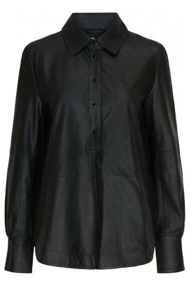 Skjorten har lange ærmer og en fin krave i halsen. Den er lidt længere bagtil.- Pasform: Løstsiddende