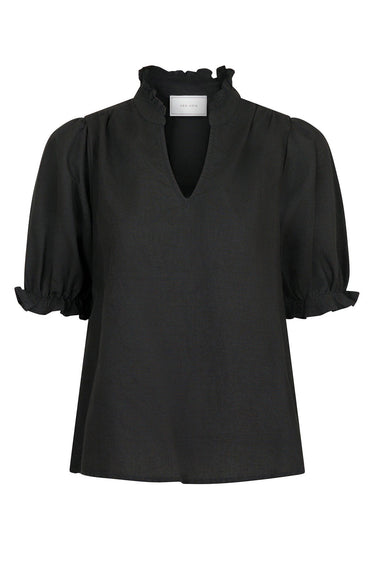Feminin bluse fra Neo Noir med korte pufærmer, v-hals med en lille flæsekant og en dejlig let kvalitet af hør og bomuld.