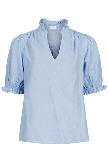 - Feminin bluse fra Neo Noir med korte pufærmer, v-hals med en lille flæsekant og en dejlig let kvalitet af hør og bomuld.