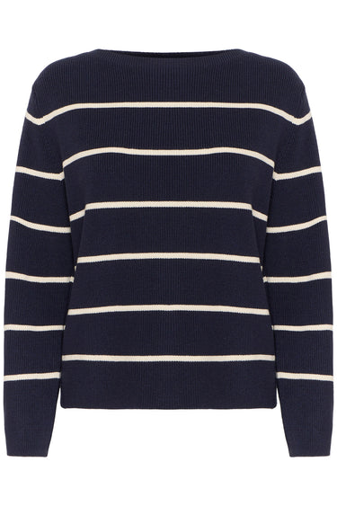 OBS! Fjernlager. Levering kan blive forlænget med 2-3 dage, hvis varen ikke findes i vores butik lige nu.Blød og lækker strik fra Ichi med lange ærmer, bådudskæring i halsen og et klassisk stribet print.