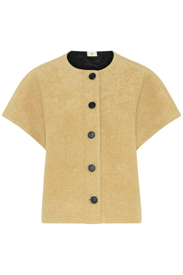 - OBS! Fjernlager. Levering kan blive forlænget med 2-3 dage, hvis varen ikke findes i vores butik lige nu.Kort vest fra Heartmade med rund hals og synlig knaplukning. Den har dropped skuldersøm og en løs, men formet pasform, der fanger skulderen elegant.