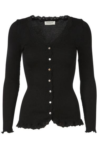 - Super fin og feminin cardigan fra Rosemunde med lange ærmer, v-udskæring i halsen og en tætsiddende pasform. Cardiganen er også detaljeret med skønne blonder og fine krøllede kanter.