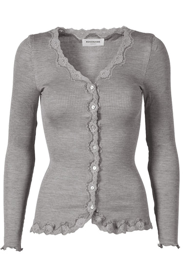 - Super fin og feminin cardigan fra Rosemunde med lange ærmer, v-udskæring i halsen og en tætsiddende pasform. Cardiganen er også detaljeret med skønne blonder og fine krøllede kanter.