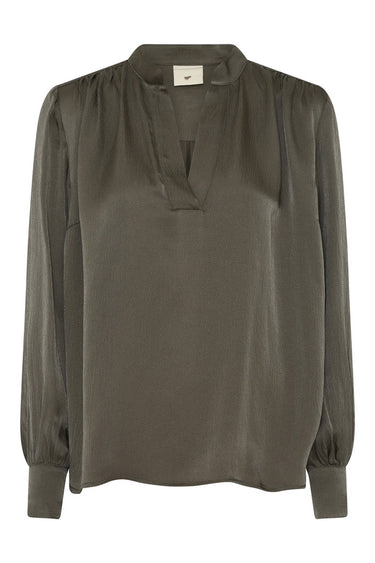 OBS! Fjernlager. Levering kan blive forlænget med 2-3 dage, hvis varen ikke findes i vores butik lige nu.Feminin bluse fra Heartmade med lange ærmer, tætsiddende manchetter og kinakrave med v-udskæring i halsen.