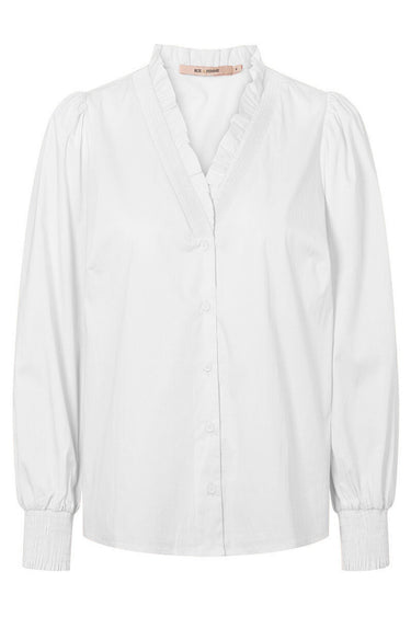 - OBS! Fjernlager. Levering kan blive forlænget med 2-3 dage, hvis varen ikke findes i vores butik lige nu.Feminin skjorte fra Rue de Femme med lange ærmer og smockdetaljer på manchetterne. Den har fine flæser omkring halsudskæringen, der tilføjer et romantisk touch til designet.
