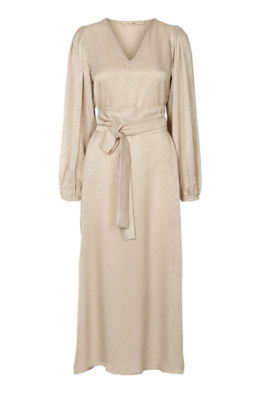 - OBS! Fjernlager. Levering kan blive forlænget med 2-3 dage, hvis varen ikke findes i vores butik lige nu.Elegant kjole fra Rue de Femme med lange ærmer, v-udskæring i halsen og et bredt bindebånd i taljen.Kjolen har også en lækker kvalitet og en super fin og feminin silhuet.