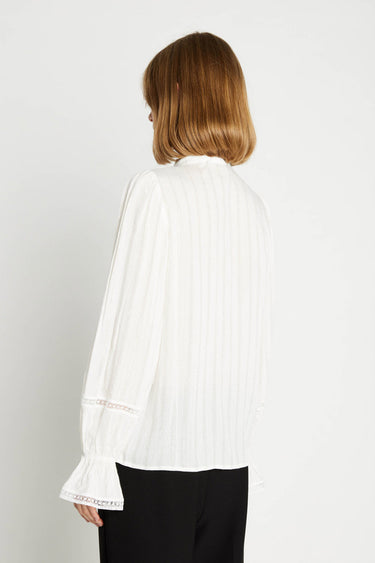 OBS! Fjernlager. Levering kan blive forlænget med 2-3 dage, hvis varen ikke findes i vores butik lige nu.Smuk skjortebluse fra Rue de Femme med lange ærmer, kinakrave med flæsedetaljer i halsen og knaplukning langs fronten.Blusen har også fine detaljer og en afslappet silhuet.