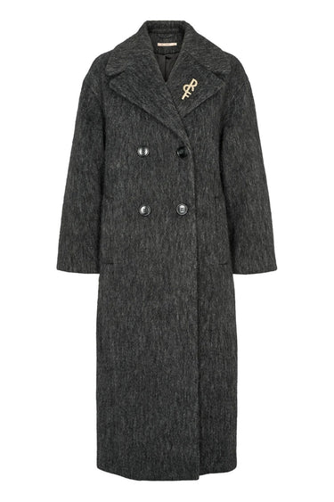OBS! Fjernlager. Levering kan blive forlænget med 2-3 dage, hvis varen ikke findes i vores butik lige nu.Smuk dobbeltradet frakke fra Rue de Femme med en struktureret kvalitet, lange ærmer, og en bred krave i halsen.Frakken har også skjulte sidelommer og et smukt logo på kraven.