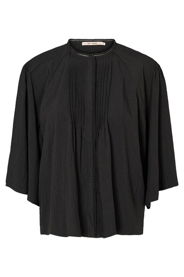 OBS! Fjernlager. Levering kan blive forlænget med 2-3 dage, hvis varen ikke findes i vores butik lige nu.Feminin bluse fra Rue de Femme med en løs silhuet, ¾ lange ærmer og smukke læg over brystet.