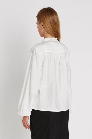 OBS! Fjernlager. Levering kan blive forlænget med 2-3 dage, hvis varen ikke findes i vores butik lige nu.Feminin skjortebluse fra Rue de Femme med lange ærmer, kinakrave i halsen og knaplukning langs fronten.