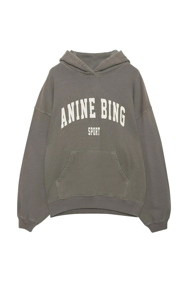 Lækker oversize sweatshirt fra Anine Bing med en dejlig bomulds kvalitet, der er fremstillet af 100% økologiske materialer.Sweatshirten har et cool logo tryk på brystet, lomme foran, hætte og lette slidtage detaljer, der giver den et råt vintage look.