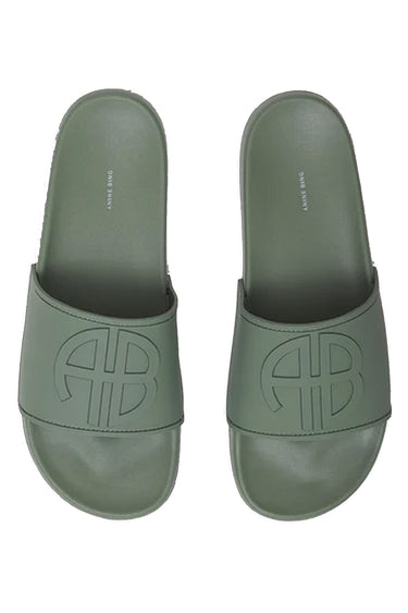 - OBS! Fjernlager. Levering kan blive forlænget med 2-3 dage, hvis varen ikke findes i vores butik lige nu.Super smarte slides fra Anine Bing med monogram over foden og et helt enkelt udtryk.