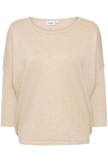 OBS! Fjernlager\nLeveringen kan blive forlænget med 1-2 dage, hvis varen ikke er at finde i vores butik lige nu.\n\nModel A2561, MilaSZ R-Neck Pullover STRIK 30500003 Jojoba MelangeLækker og enkel strik fra Saint Tropez med ¾ lange ærmer, rund hals og en afslappet pasform.