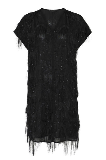 OBS! Fjernlager. Levering kan blive forlænget med 2-3 dage, hvis varen ikke findes i vores butik lige nu.Smuk kjole fra Bruuns Bazaar med korte ærmer, v-udskæring i halsen og de skønneste frynser.
