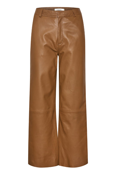 OBS! Fjernlager. Levering kan blive forlænget med 1-2 dage, hvis varen ikke findes i vores butik lige nu.Flotte skindbukser fra Gestuz med en løstsiddende pasform, straight-leg silhuet og bæltestropper i taljen. Bukserne har også en lækker kvalitet og enkelt udtryk.