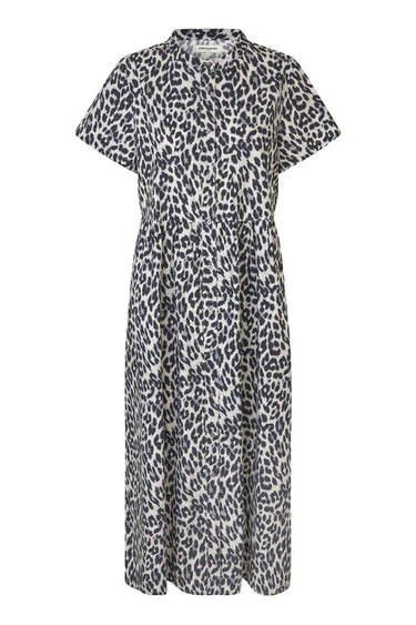- OBS! Fjernlager. Levering kan blive forlænget med 2-3 dage, hvis varen ikke findes i vores butik lige nu.Smuk og alsidig kjole fra Lollys Laundry, perfekt til både hverdag og særlige lejligheder. Kjolen er fremstillet i et let og komfortabelt materiale, prydet med et trendy, gråt leopardmønster, der giver den et moderne og iøjnefaldende look. Med sin løse pasform og korte ærmer er kjolen designet til at give maksimal komfort og bevægelsesfrihed, mens den samtidig skaber et feminint og elegant udtryk. Den har knaplukning til taljen foran, som tilføjer et klassisk twist, og den let markerede talje fremhæver din figur på en smigrende måde.