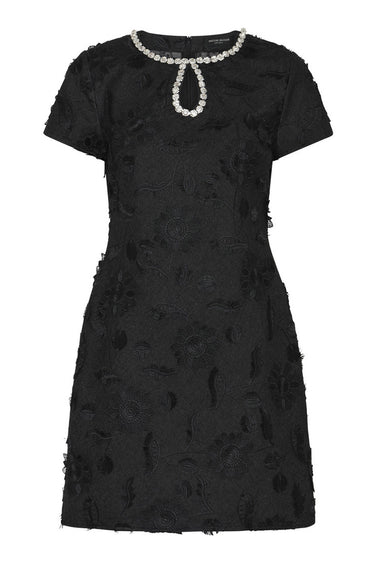OBS! Fjernlager. Levering kan blive forlænget med 2-3 dage, hvis varen ikke findes i vores butik lige nu.Smuk kjole fra Bruuns Bazaar med korte ærmer, rund hals og en flot figursyet silhuet.Kjolen har også de smukkeste broderet detaljer og flotte diamanter omkring halsen.