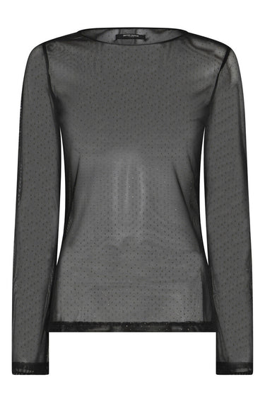 - OBS! Fjernlager. Levering kan blive forlænget med 2-3 dage, hvis varen ikke findes i vores butik lige nu.Elegant langærmet mesh bluse fra Bruuns Bazaar med lige halsudskæring og skønne små similisten.