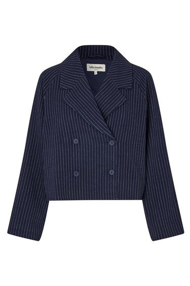 OBS! Fjernlager. Levering kan blive forlænget med 2-3 dage, hvis varen ikke findes i vores butik lige nu.Super flot jakke fra Lollys Laundry der er lavet af et elegant marineblåt stof med fine nålestriber og har en flatterende, firkantet silhuet. Jakken har en dobbeltradet knaplukning, bred reverskrave og lange ærmer.