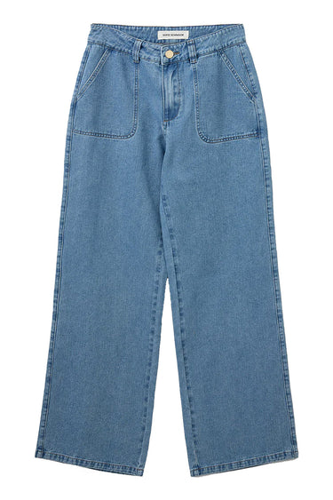 - OBS! Fjernlager. Levering kan blive forlænget med 2-3 dage, hvis varen ikke findes i vores butik lige nu.Lyseblå højtaljet jeans fra Sofie Schnoor med brede ben. Bukserne har store for- og baglommer samt klassisk lynlåslukning og knap foran. Fremstillet i en bomuldsblanding med polyester og viskose.