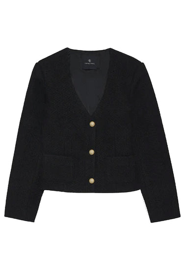 Flot jakke fra Anine Bing med ærmer, v-hals og små lommer i siderne. Jakken har også en flot diamant vævet kvalitet og lukkes i fronten med smukke guldknapper.
