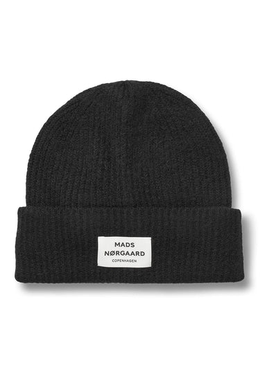 Blød, ribstrikket hue fra Mads Nørgaard med et fint opbuk og logomærke på fronten.