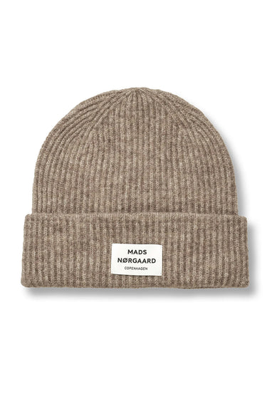 Blød, ribstrikket hue fra Mads Nørgaard med et fint opbuk og logomærke på fronten.