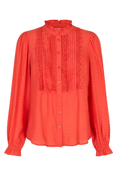 OBS! Fjernlager. Levering kan blive forlænget med 2-3 dage, hvis varen ikke findes i vores butik lige nu.Elegant og romantisk style fra Lollys Laundry, der kombinerer klassisk design med fine detaljer. Skjorten er lavet i et blødt og let materiale, der føles behageligt mod huden og giver et luftigt look. Den er designet med lange ærmer, en høj krave med flæsedetaljer og knaplukning langs hele fronten. De smukke broderede og plisserede detaljer på brystet tilfører et feminint og sofistikeret udtryk.