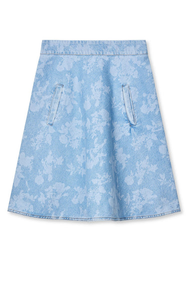 Knælang denim nederdel fra Mads Nørgaard med en bred kant i taljen og smarte lommer foran.