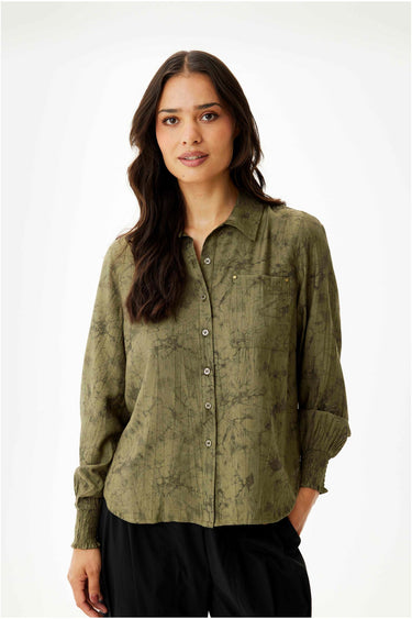 OBS! Fjernlager. Levering kan blive forlænget med 2-3 dage, hvis varen ikke findes i vores butik lige nu.Smart skjortebluse fra In Front med lange let puffede ærmer, tætsiddende smock manchetter og en fin krave i halsen.Blusen har også en lille lomme på brystet, knaplukning og et flot abstrakt print.