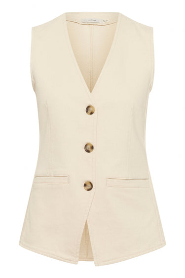 OBS! Fjernlager. Levering kan blive forlænget med 2-3 dage, hvis varen ikke findes i vores butik lige nu.Flot vest fra InWear med et elegant snit og fine detaljer.Vesten har et enkelt og feminint snit, v-udskæring i halsen og knaplukning langs fronten.