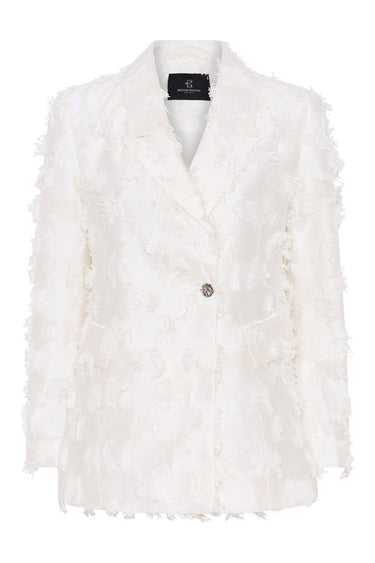 - OBS! Fjernlager. Levering kan blive forlænget med 2-3 dage, hvis varen ikke findes i vores butik lige nu.Smuk blazer fra Bruuns Bazaar med lange ærmer, v-udskæring i halsen og lommeflapper i siderne.Jakken har også et skønt udtryk med små frynser og en super flot knap til at lukke med foran.