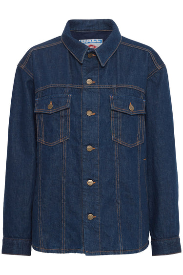 Cool oversize denim jakke fra Ball med lange ærmer, skjortekrave i halsen og store lommer på brystet.Jakken har også et smart print på ryggen og knaplukning foran.
