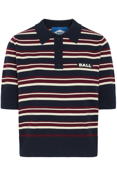 OBS! Fjernlager. Levering kan blive forlænget med 2-3 dage, hvis varen ikke findes i vores butik lige nu.Fin strik fra Ball med korte ærmer, rund hals med en blød polo krave i halsen og et klassisk stribet mønster.
