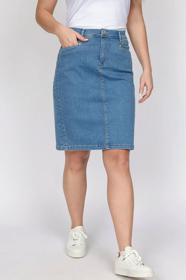 Flot enkel denim nederdel fra 2-Biz med lommer i siderne og knaplukning.