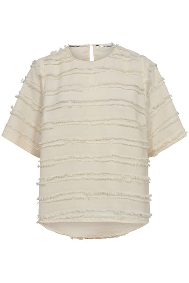 OBS! Fjernlager. Levering kan blive forlænget med 2-3 dage, hvis varen ikke findes i vores butik lige nu.Fin tee fra Co'couture med korte ærmer, rund hals og skønne frynser.