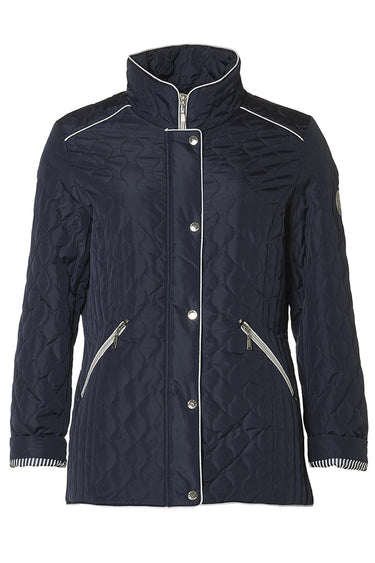 OBS! Fjernlager. Levering kan blive forlænget med 2-3 dage, hvis varen ikke findes i vores butik lige nu.Super flot quiltet jakke fra Danwear med lange ærmer, høj hals og et smart stribet foer.Jakken har også flotte kontrastfarvet kanter, skrå lynlåslommer og skjult lynlåslukning langs fronten bag et trykknappanel.