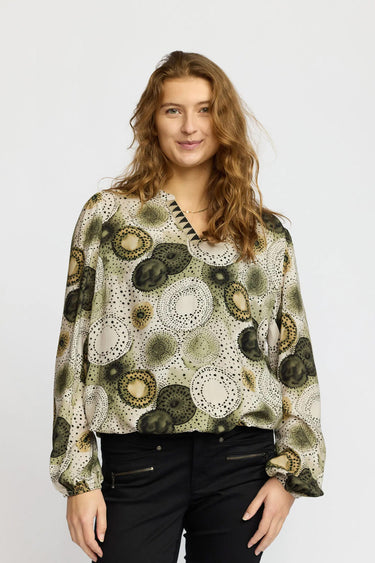 - OBS! Fjernlager. Levering kan blive forlænget med 2-3 dage, hvis varen ikke findes i vores butik lige nu.Smart bluse fra 2-Biz med lange ærmer, rund hals med v-udskæring og et fint print.