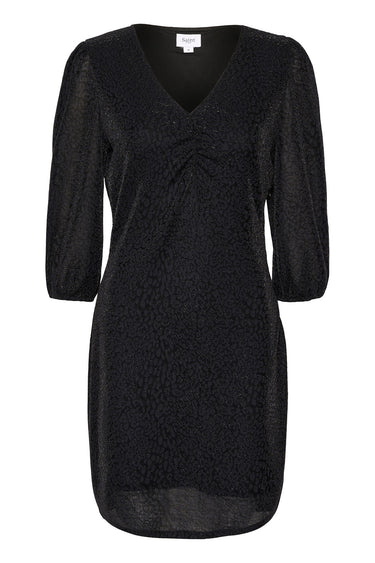 - OBS! Fjernlager. Levering kan blive forlænget med 2-3 dage, hvis varen ikke findes i vores butik lige nu.Feminin kjole fra Saint Tropez med ¾ lange ærmer, v-udskæring i halsen og fine rynkeeffekter over brystet. Kjolen har også en flot silhuet og lette glimmereffekter i kvalitet.