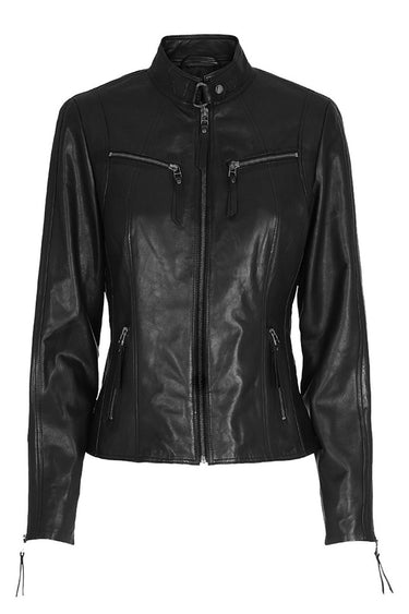 Biker jakke i blødt lammeskind med lynlås foran og høj krave med knaplukning. Jakken har 4 forlommer med lynlåslukning samt lynlås ved ærmerne.