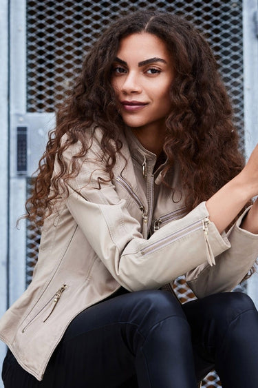 Biker jakke i blødt lammeskind med lynlås foran og høj krave med knaplukning. Jakken har 4 forlommer med lynlåslukning samt lynlås ved ærmerne.Vær opmærksom på, at materialer af naturlig oprindelse kan variere i farven.