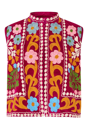 - OBS! Fjernlager. Levering kan blive forlænget med 2-3 dage, hvis varen ikke findes i vores butik lige nu.Gå efter en boheme-inspireret stil med denne vest fra Lollys Laundry, et rigtigt statement-piece, der tilføjer farve og karakter til ethvert outfit. Vesten er lavet i en luksuriøs, blød velour og den er prydet med smukke blomsterbroderier i livlige nuancer som lyserød, blå og grøn på en klassisk grå eller dyb pink baggrund. Det dristige mønster giver vesten et vintage-look med et moderne twist, perfekt til at style over en enkel t-shirt eller din yndlingskjole.
