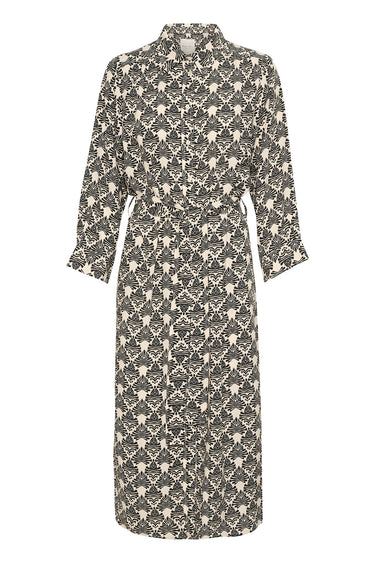 OBS! Fjernlager. Levering kan blive forlænget med 2-3 dage, hvis varen ikke findes i vores butik lige nu.Smart skjortekjole fra Part Two med ¾ lange ærmer, skjortekrave i halsen og et matchende bindebælte i taljen.Kjolen har også et fint print og lukkes med små knapper langs fronten.