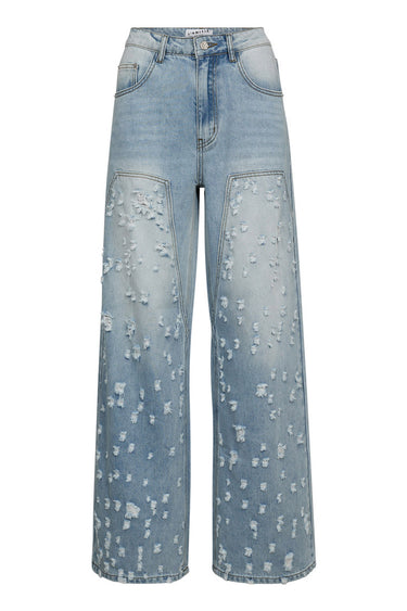 OBS! Fjernlager. Levering kan blive forlænget med 2-3 dage, hvis varen ikke findes i vores butik lige nu.Super cool jeans fra Haute L'Amitié med vidde i benene, en lyseblå vask og det flotteste slidte detaljer der giver bukserne et unikt udtryk.