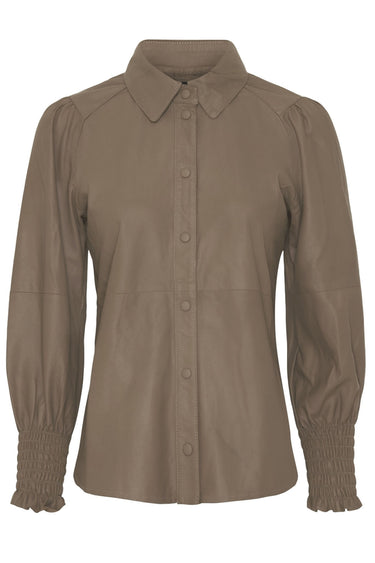 Flot skindbluse fra Notyz med lange ærmer, blød krave i halsen og flotte smock manchetter. Blusen har også en flot pasform og beklædte knapper langs fronten til at lukkes med.