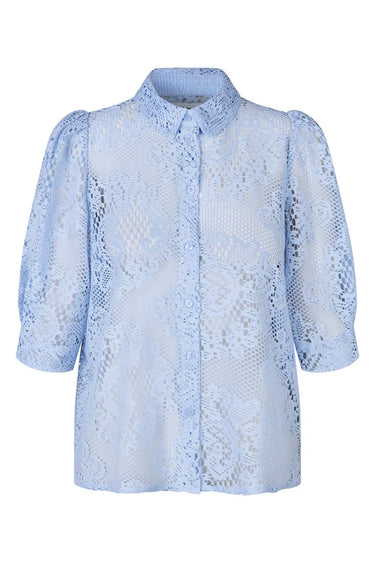 OBS! Fjernlager. Levering kan blive forlænget med 2-3 dage, hvis varen ikke findes i vores butik lige nu.Feminin skjorte fra Lollys Laundry i et delikat blondemateriale i støvet blå, der giver et elegant og sofistikeret udtryk. Skjorten har 3/4 ærmer, en klassisk krave og knaplukning foran, som tilføjer et tidløst element til designet. De let puffede ærmer med læg ved skulderen og som afsluttes med en bred manchet, tilfører et moderne twist og giver skjorten en smuk silhuet.