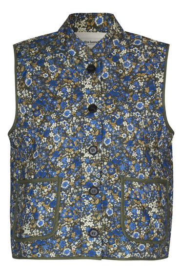 OBS! Fjernlager. Levering kan blive forlænget med 2-3 dage, hvis varen ikke findes i vores butik lige nu.Skøn vatteret vest fra Lollys Laundry med en fin krave i halsen, knaplukning langs fronten og lommer foran.Vesten har også et skønt all-over print og en afslappet silhuet.