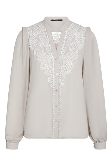 - OBS! Fjernlager. Levering kan blive forlænget med 2-3 dage, hvis varen ikke findes i vores butik lige nu.Smuk og elegant skjorte med v udskæring fra Bruuns Bazaar. Skjorten er designet i et regular fit, med fin læg detalje ved ærme, en similisten knap ved krave og blondebånd foran og bag.