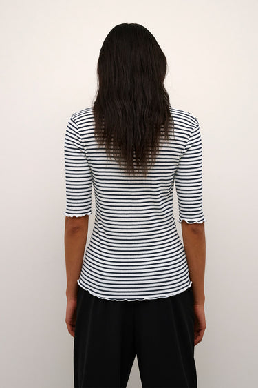 OBS! Fjernlager. Levering kan blive forlænget med 1-2 dage, hvis varen ikke findes i vores butik lige nu.Sød top fra Karen By Simonsen med korte ærmer og høj hals. Toppen har en fin stribet kvalitet og flotte rynkekanter.