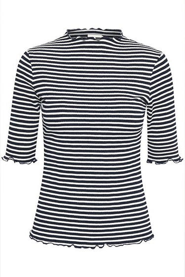 OBS! Fjernlager. Levering kan blive forlænget med 1-2 dage, hvis varen ikke findes i vores butik lige nu.Sød top fra Karen By Simonsen med korte ærmer og høj hals. Toppen har en fin stribet kvalitet og flotte rynkekanter.